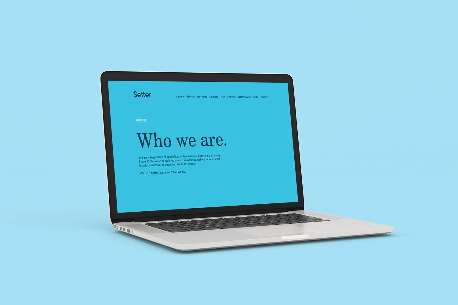 Setter Capital approached us to rebrand their identity to reflect their growth and ambition. After a crash course in secondary markets, we created an identity that balanced their bold personality with traditional elements to maintain credibility with legacy clients. The rallying cry, "First in the Secondary Market," captured their confidence and leadership in one powerful line.